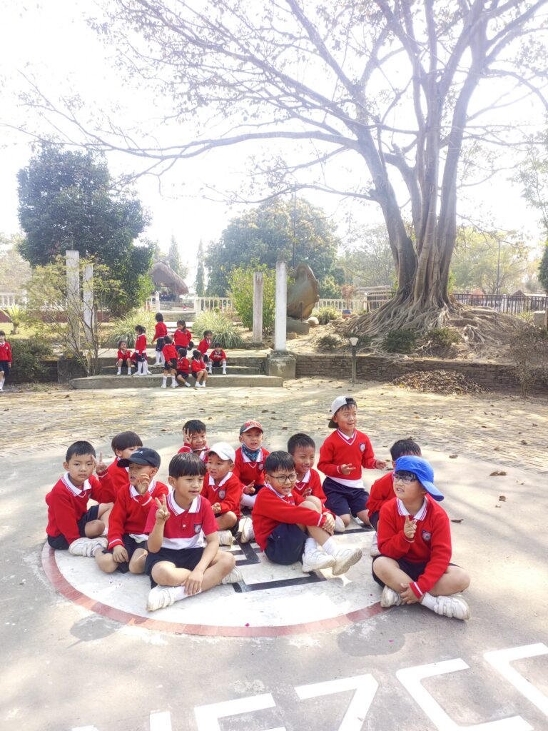 The little ones arrived at school bubbling with excitement, ready for their special day. Accompanied by their teachers and sisters, they travelled together by bus, filling the journey with happy chatter, action songs, and bright smiles. Yongmen from Milky Ways was so excited for the outing as she sat on the bus, she asked, ‘Are we going for a picnic?’. Liziro excitedly pointed towards the excavator through the window of the moving bus and said look it’s an excavator. As the road was slightly bumpy Kuvuka from Precious Angels curiously asked,’Why is the bus tuk tuk tuk?’. Susho from Angel Stars noticed a pond and excitedly said,’Look fish!’, showing his curiousity about the World around him. Their enthusiasm made the short trip lively and full of energy.